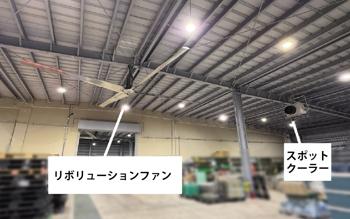 強力なスポットクーラーから出る冷たい風を、天井の「リボリューションファン」で撹拌・拡散させ、これにより、高コストな全体空調工事を行うことなく倉庫全体に涼しい風を行き渡らせることに成功しました。