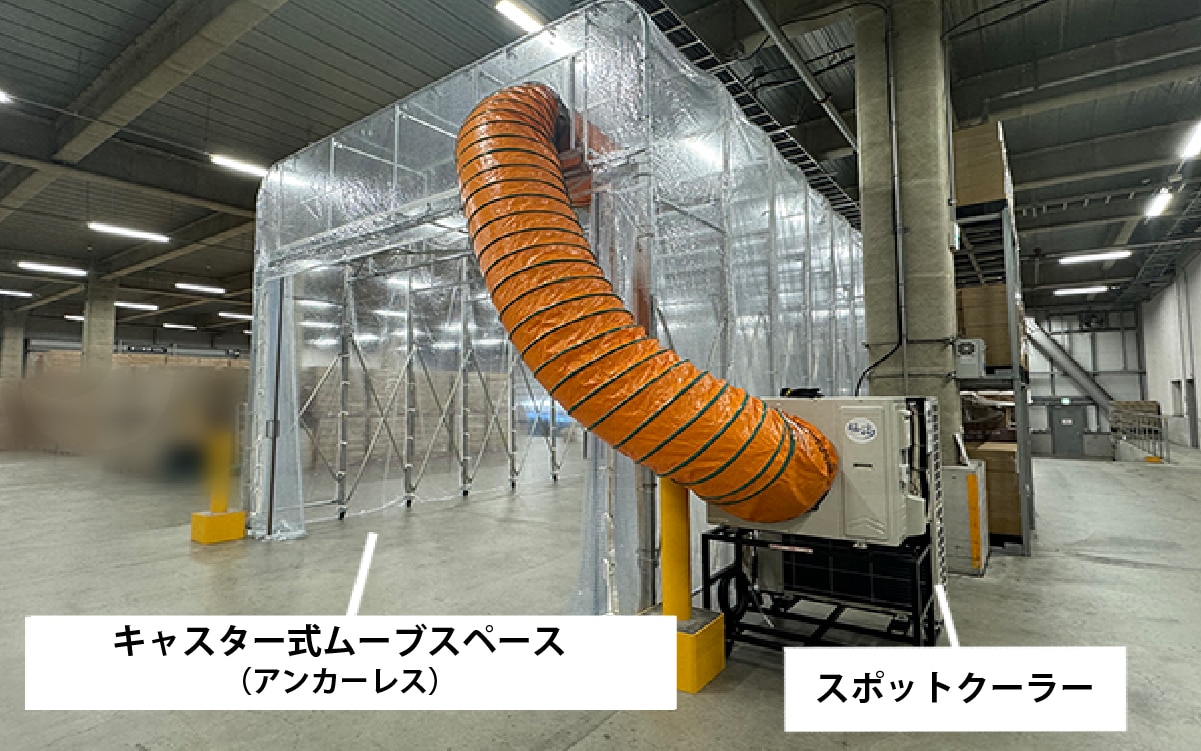 倉庫内にキャスター付きのムーブスペースを設置し、施設内を区切ってその中にスポットクーラーの冷気を送り込み、管理する運用を提案。結果、低コストで倉庫の一部のみを冷やす環境創出ができました。