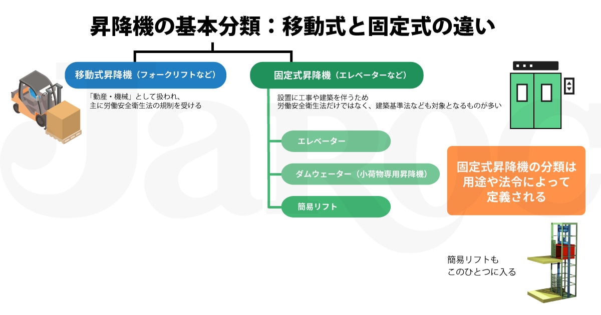 簡易リフトを含む昇降機を規律する法律は、労働者の安全を守るための「労働安全衛生法」と、建築物の安全性および利用者の安全を守るための「建築基準法」という2つの法令で主に定められてきました。