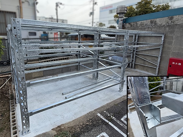屋外で空の600Φドラム缶を直置きする際に、周囲を囲うためのラックを製作してほしいとのことで、脱着式のバー付きのラックを設計しました。屋外用にさび止めを施したほか、ドラム缶が側面からも落ちないようトラス(斜めに這わせた部分)を配置しました。(K.A)