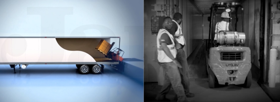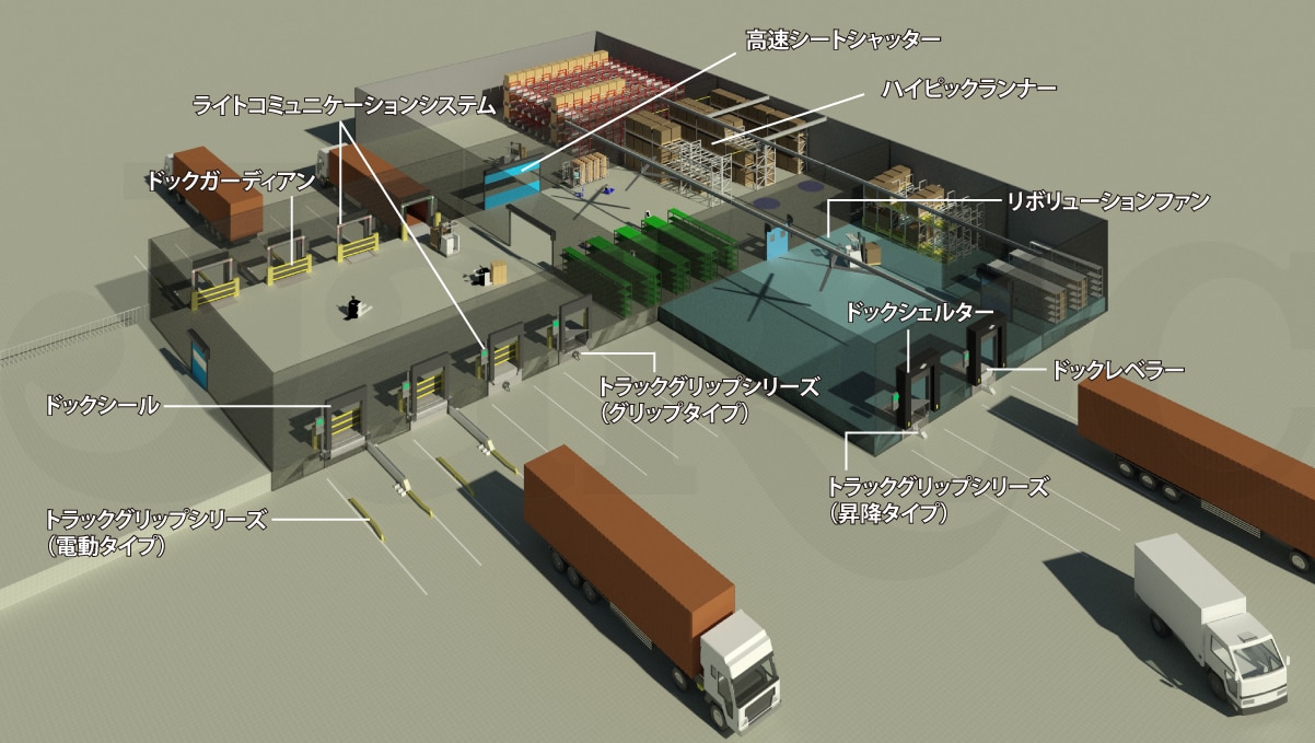 本ソリューションは、基本的にトラックの後⽅をドックにつけ、後⽅から荷積み・荷下ろしする現場を想定してご提案しています。