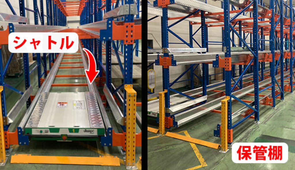 シャトルランナーはラックの奥まで自走する「シャトル」と、専用の「保管棚」から構成されています。