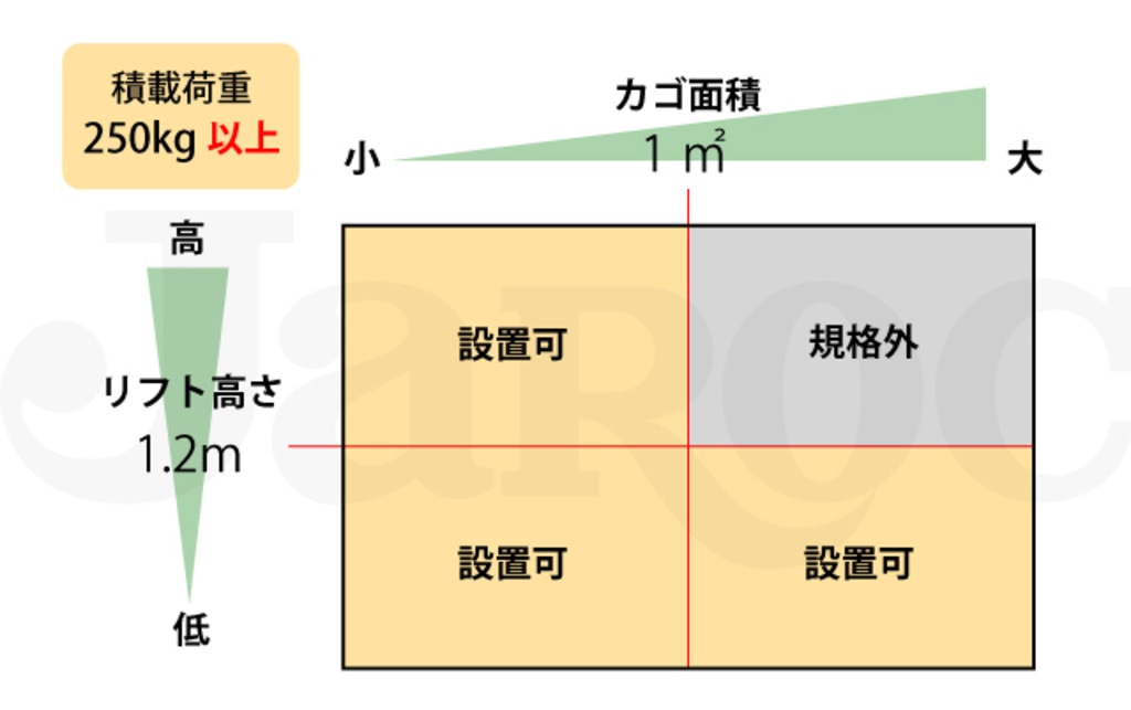 労働安全衛生法で定められている昇降機の条件の範囲内であれば、昇降する荷物の寸法、重量、昇降高さによって自由に設計が可能です。