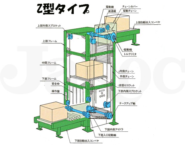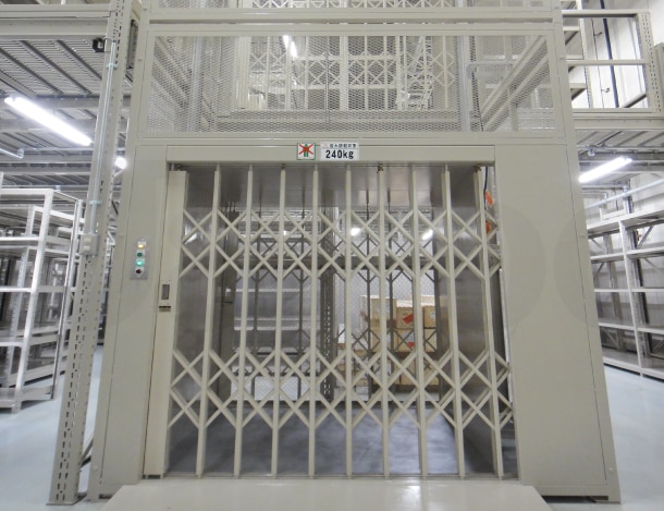 ジャロックの連続昇降機は、短時間で大量商品を1〜2Fに搬送させます。