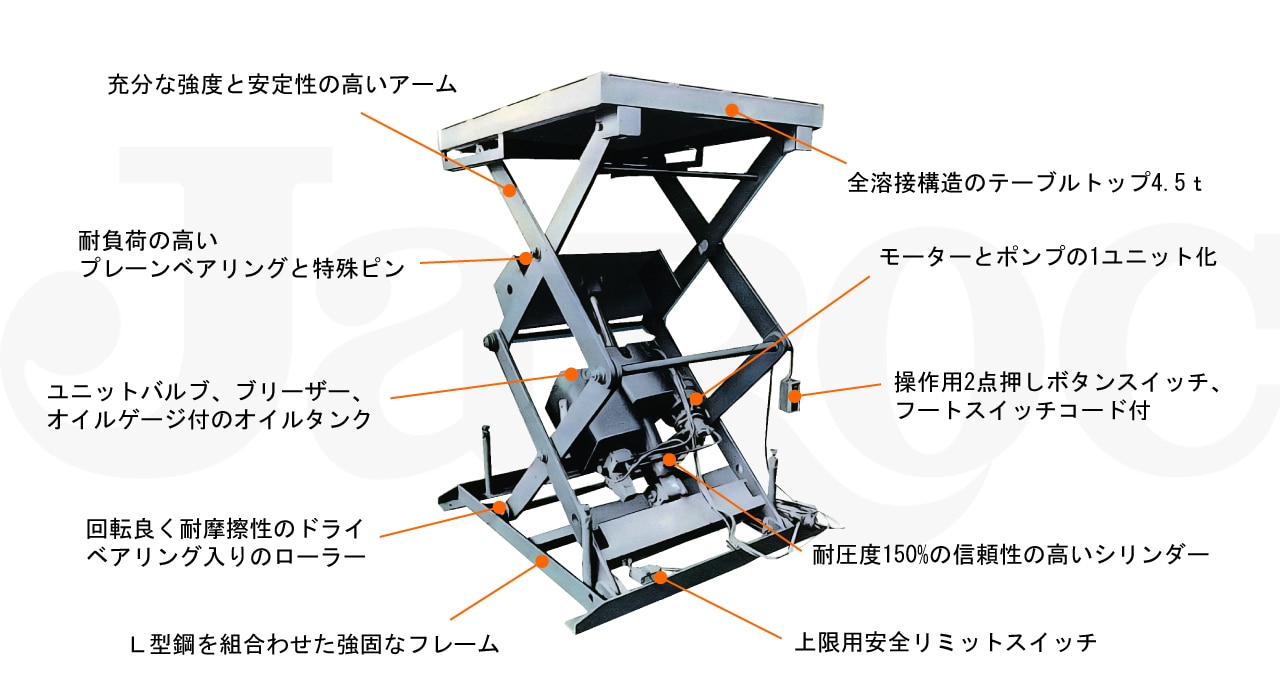 油圧パンタグラフを使用し、重量物を昇降する昇降装置です。