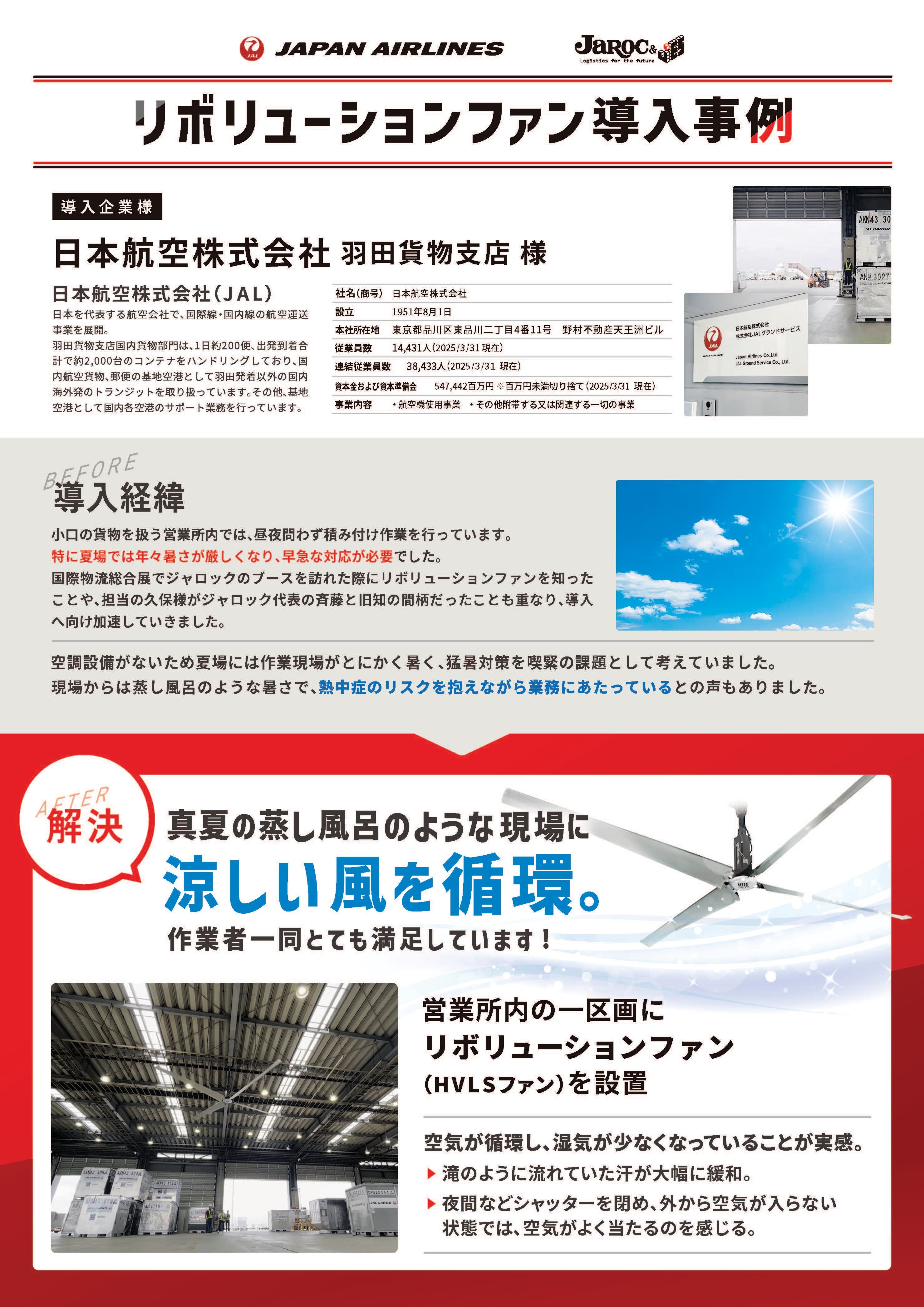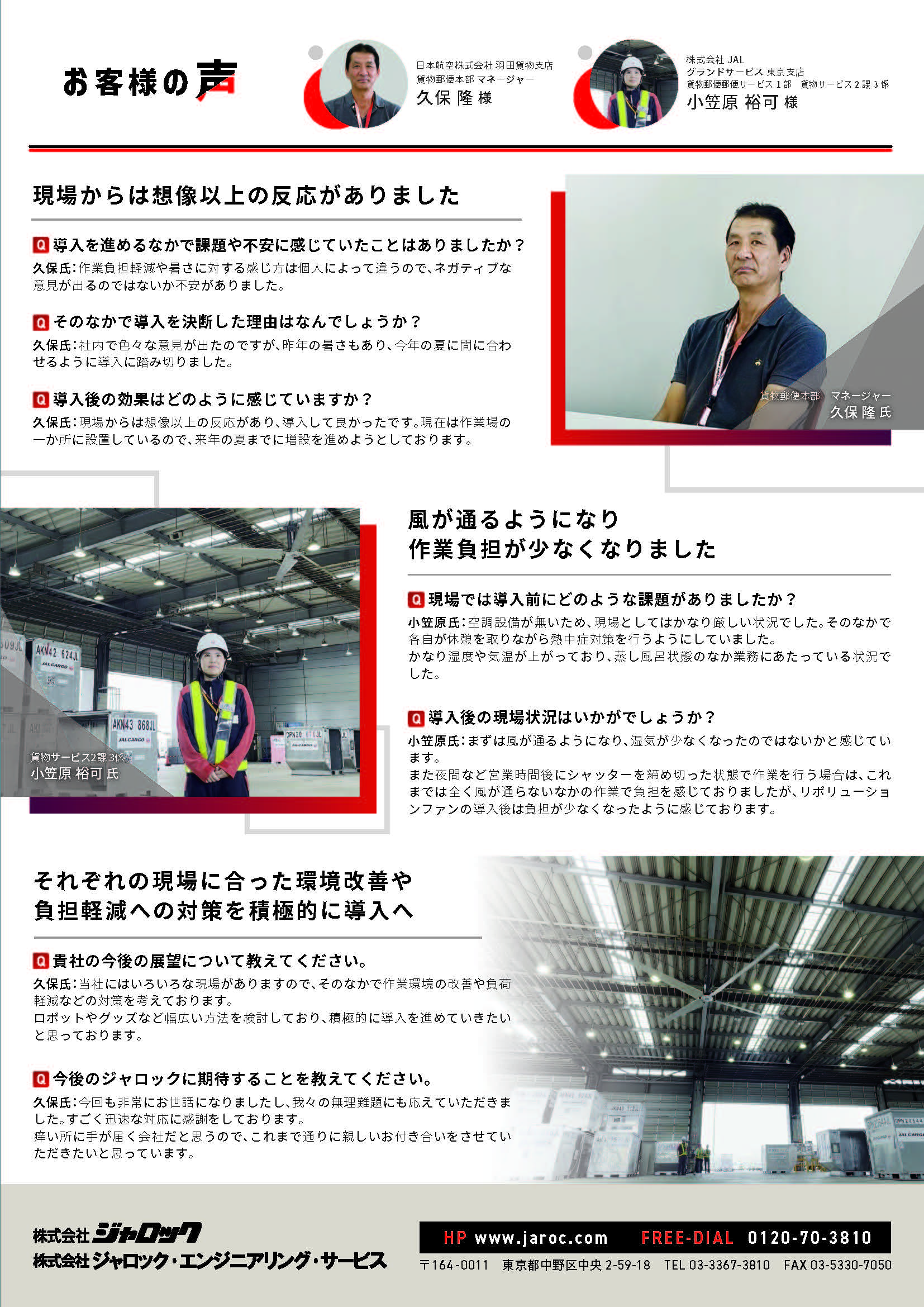 国際物流総合展でジャロックのブースを訪れた際にリボリューションファンを知ったことや、担当の久保様がジャロック代表の斉藤と旧知の間柄だったことも重なり、導入へ向け加速していきました。